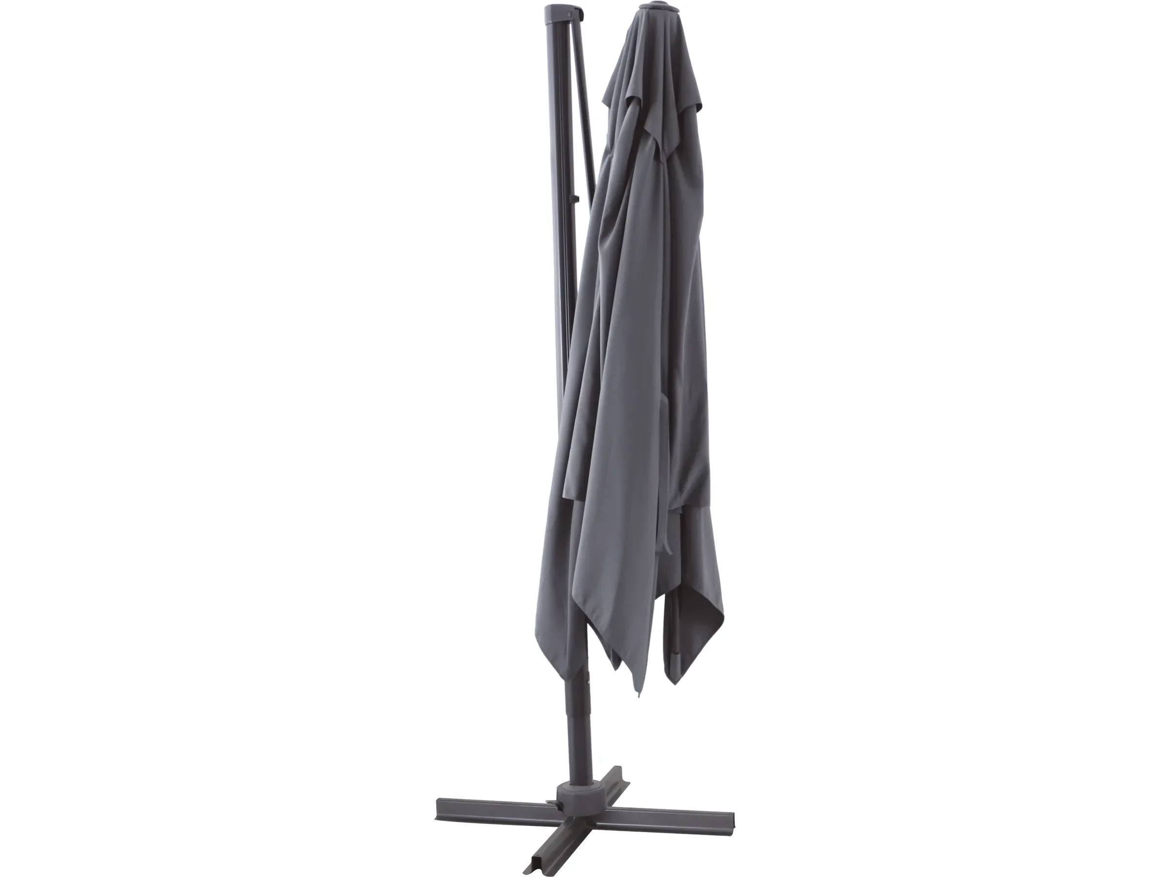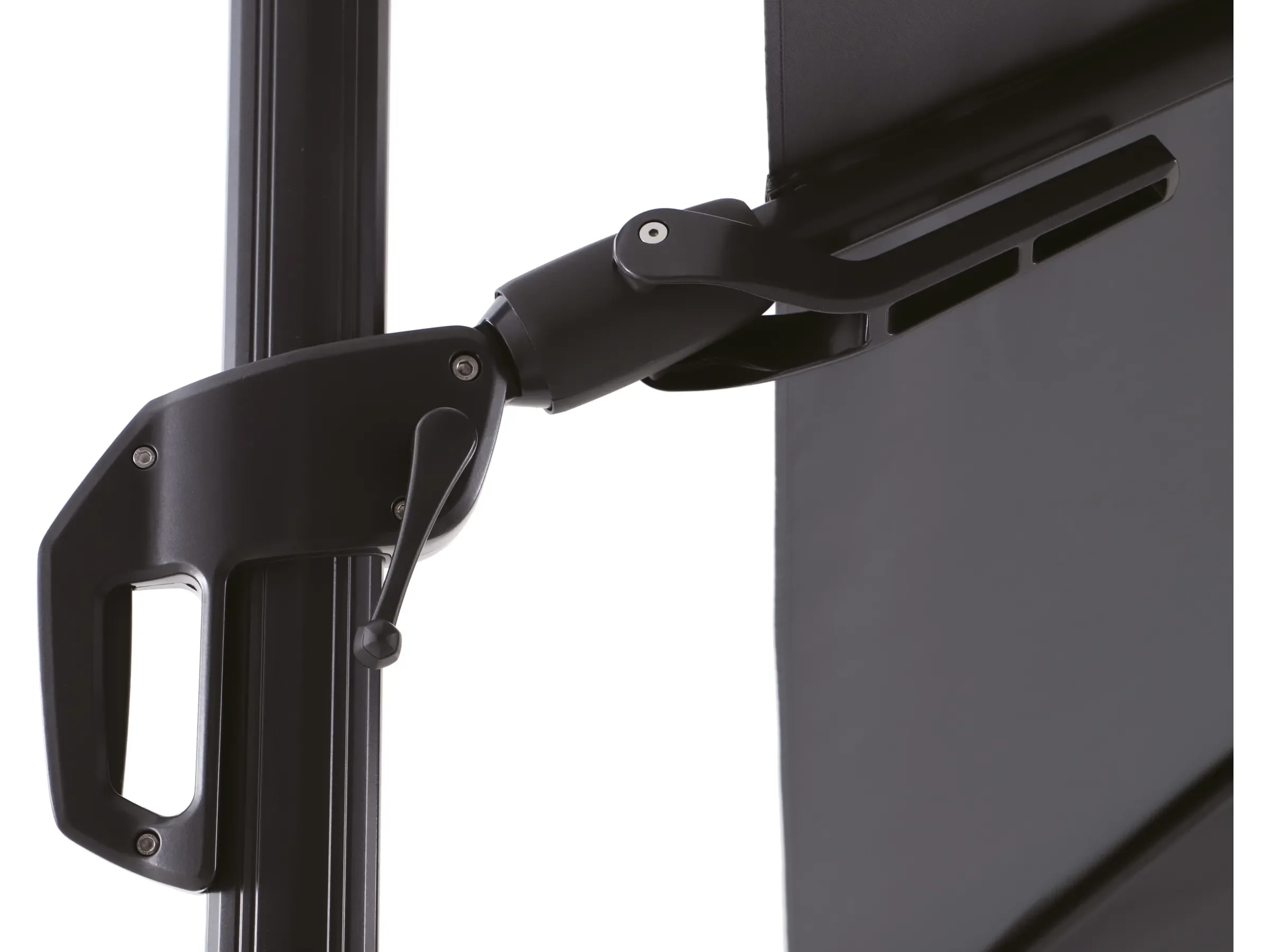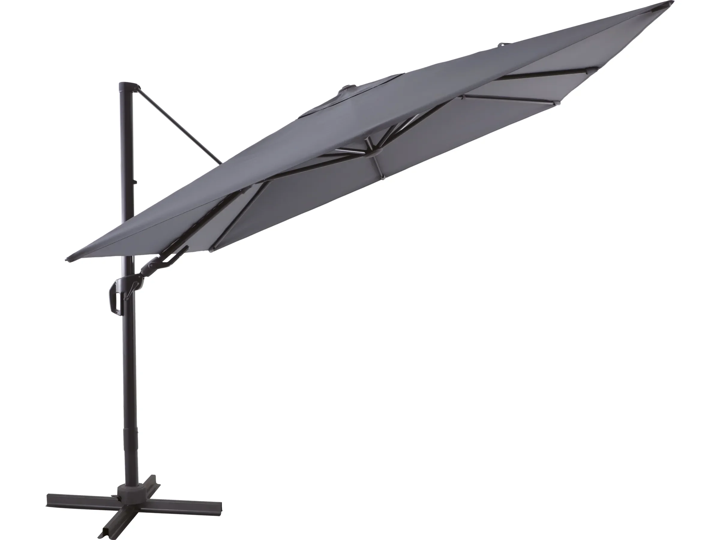 Dank seitlich positioniertem Mast bleibt die Fläche unter dem Schirm frei nutzbar. Die integrierte Kurbelmechanik ermöglicht ein komfortables Öffnen und Schließen, während Dreh- und Neigefunktion maximale Flexibilität bei der Ausrichtung bieten.
