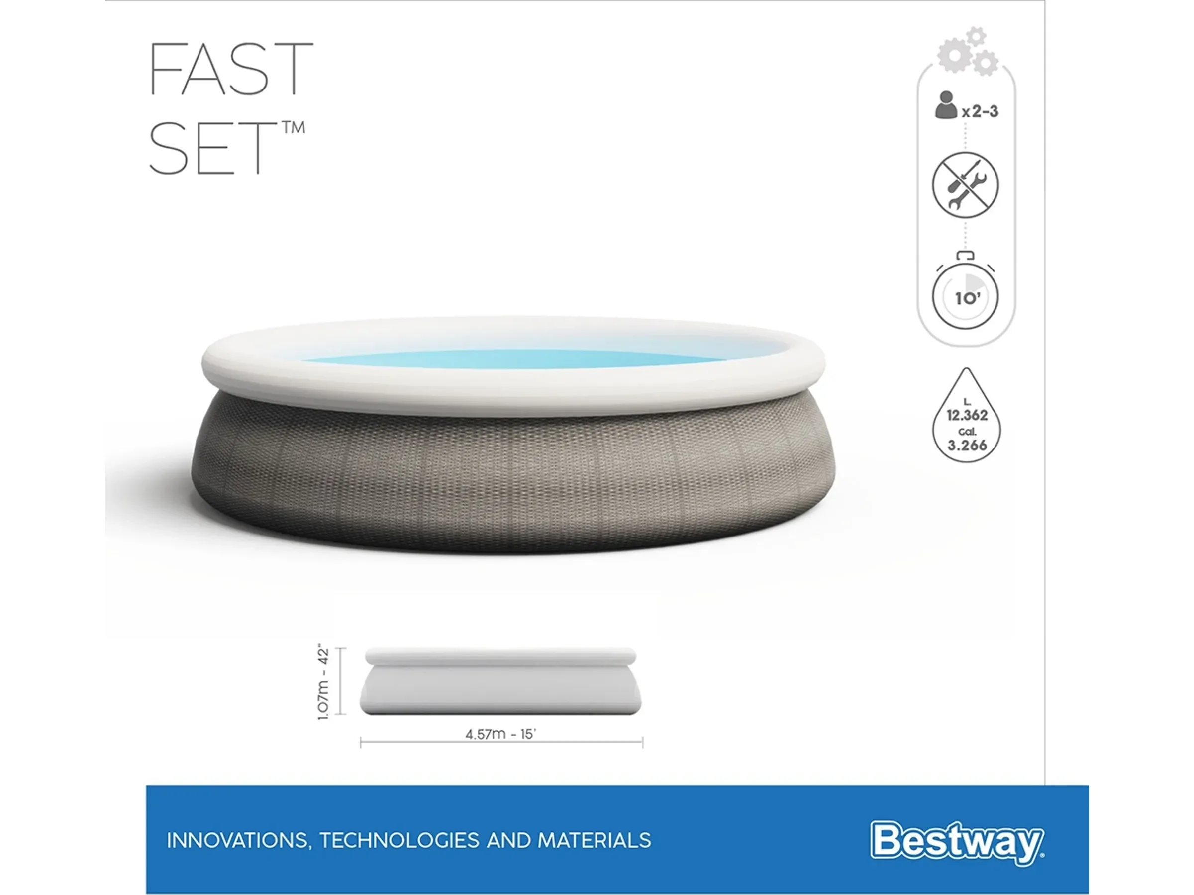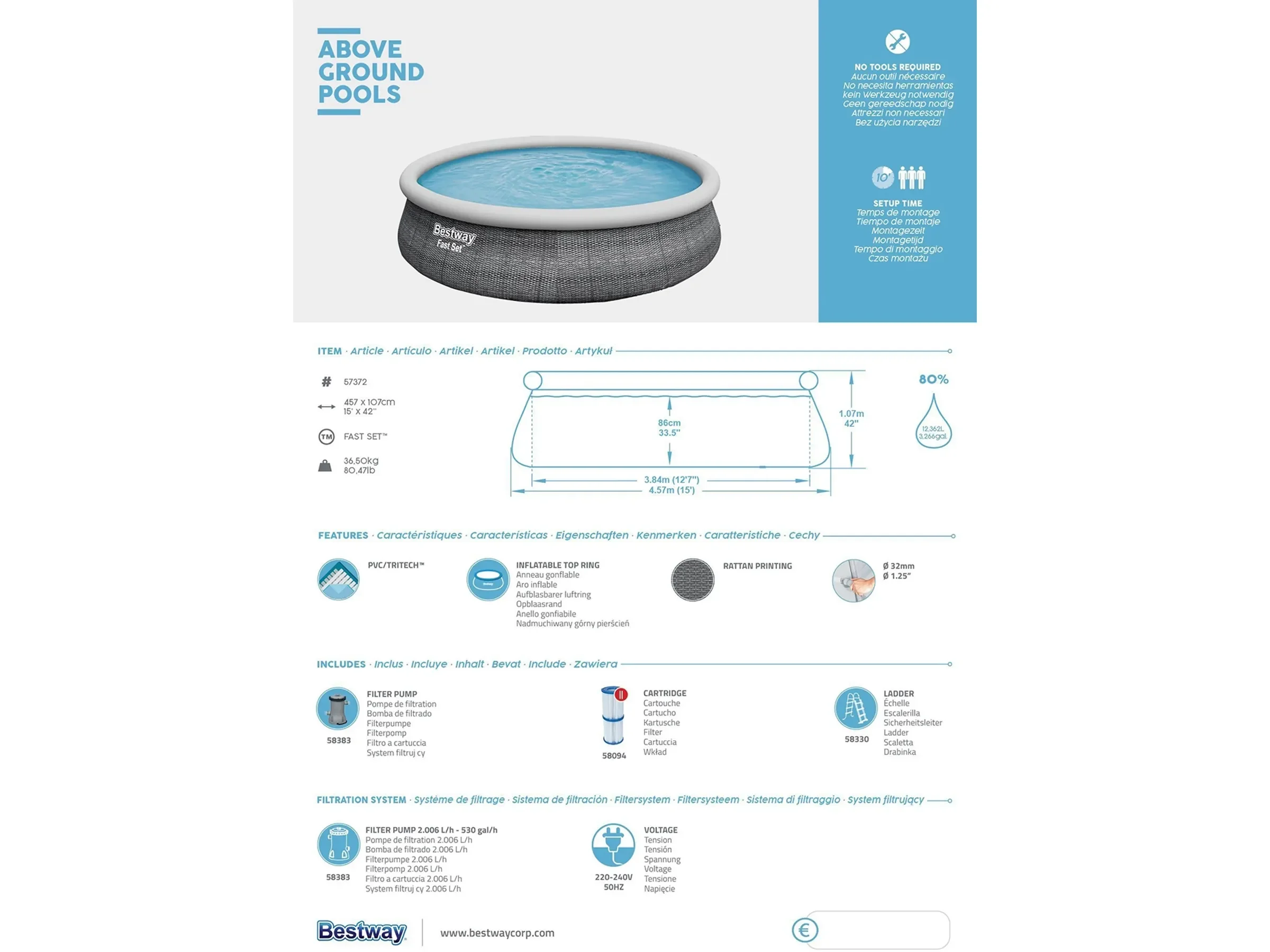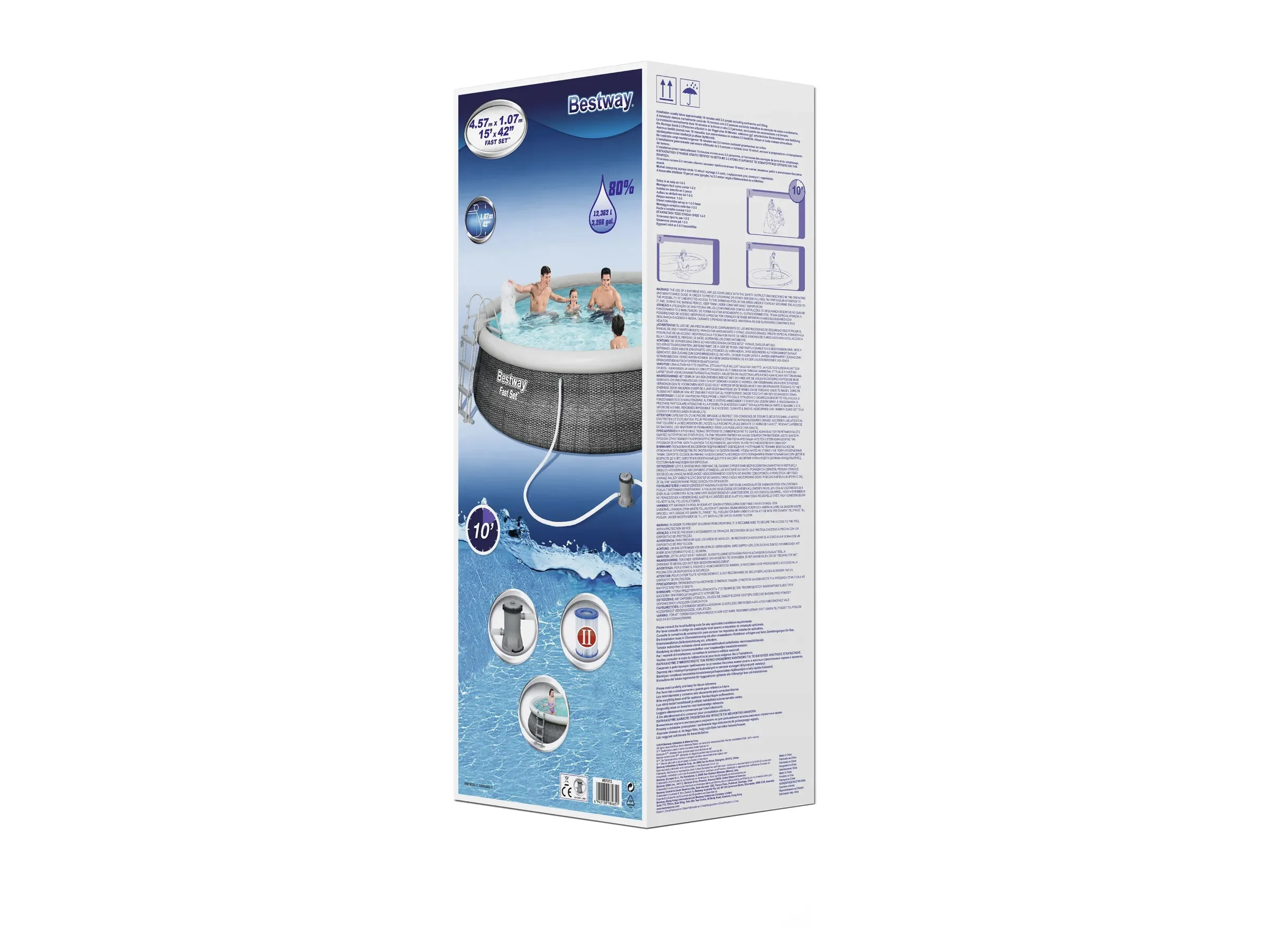 1 × Fast Set Pool Ø 457 × 107 cm 1 × Filterpumpe 2.006 l/h 1 × Filterkartusche Gr. II 1 × Sicherheitsleiter 107 cm 1 × Reparaturflicken |