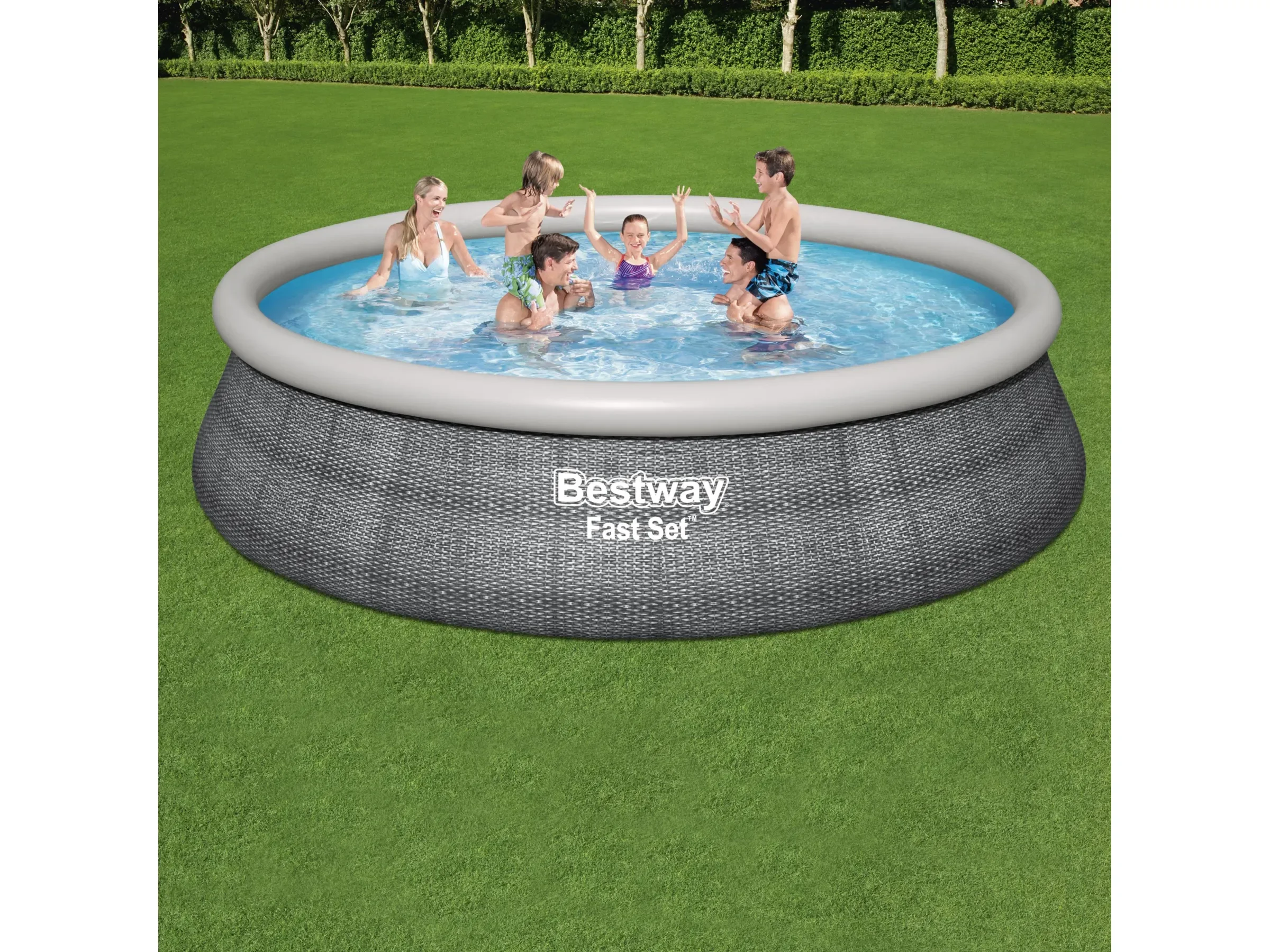 Der Fast Set Aufstellpool in eleganter Schiefergrau-Optik sorgt für erfrischenden Badespaß im eigenen Garten. Dank aufblasbarem Luftring richtet sich das Becken beim Befüllen selbstständig auf und ist in kurzer Zeit einsatzbereit – ganz ohne Werkzeug.