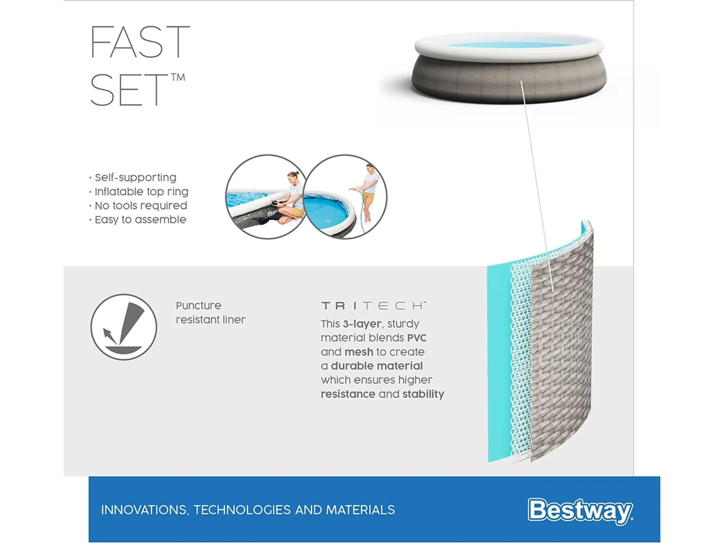 Die robuste TriTech-Poolfolie mit 3-lagigem PVC-Gewebe bietet hohe Reißfestigkeit sowie Witterungsbeständigkeit und sorgt für langlebige Nutzung über viele Sommersaisons hinweg.