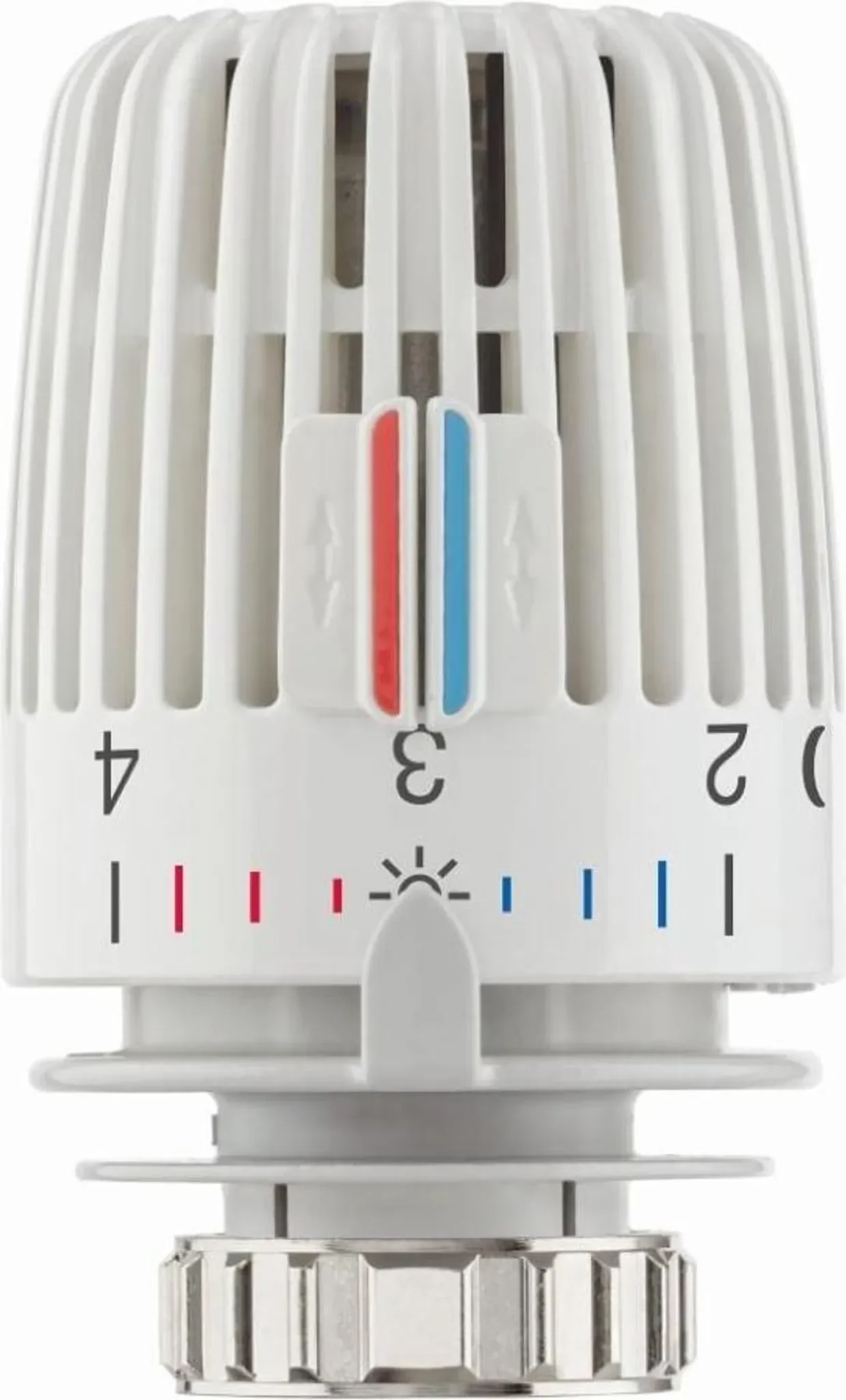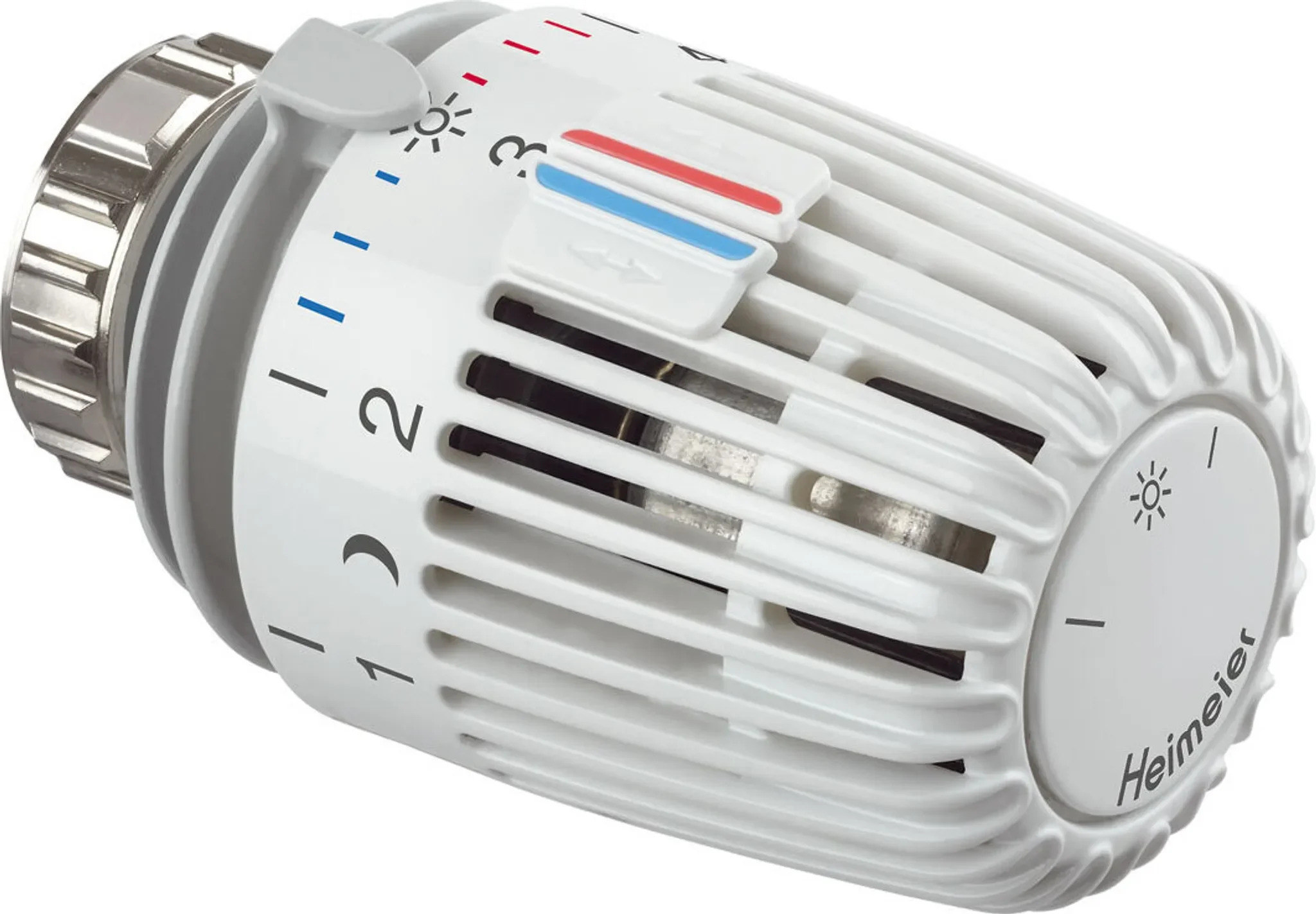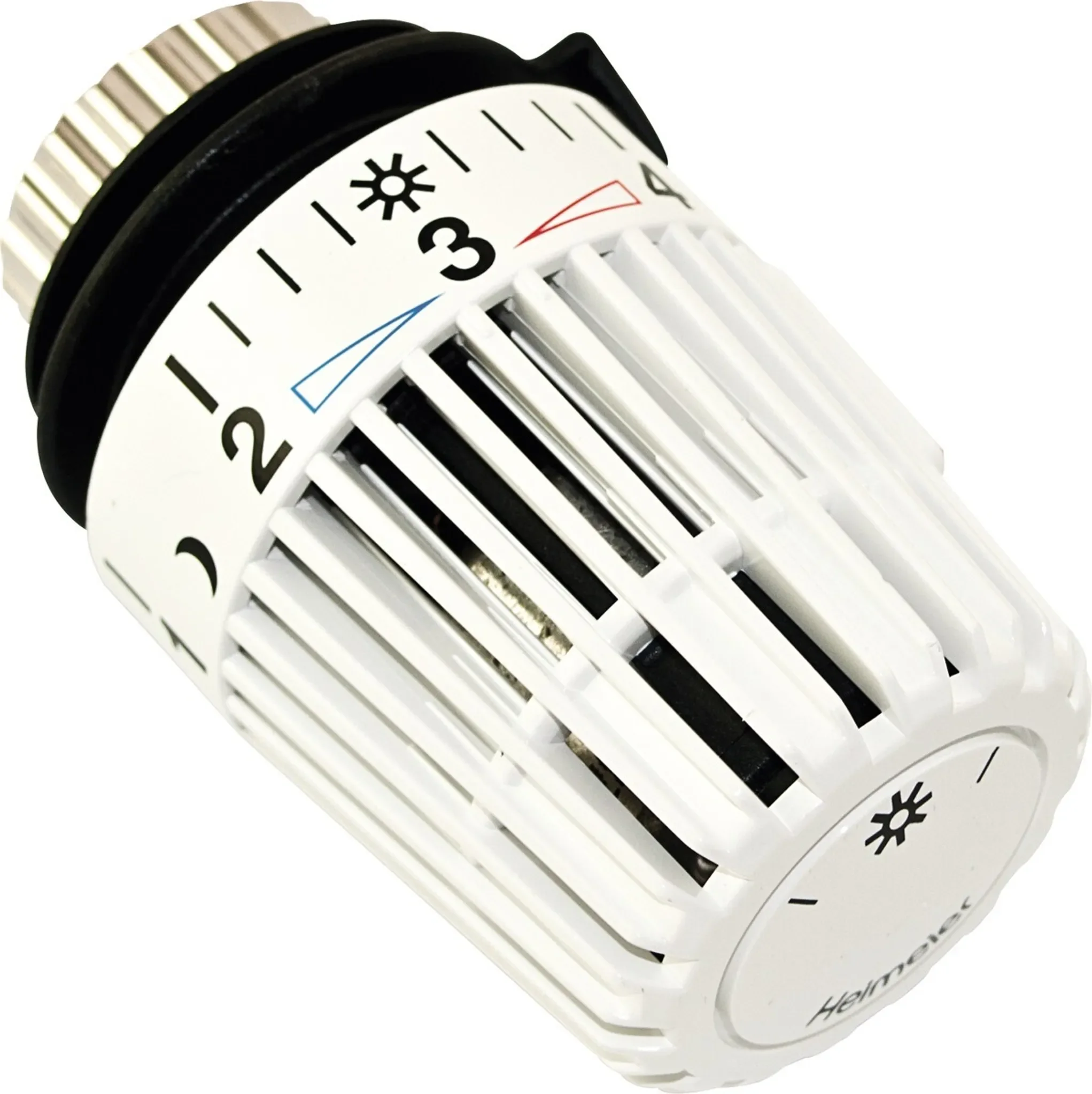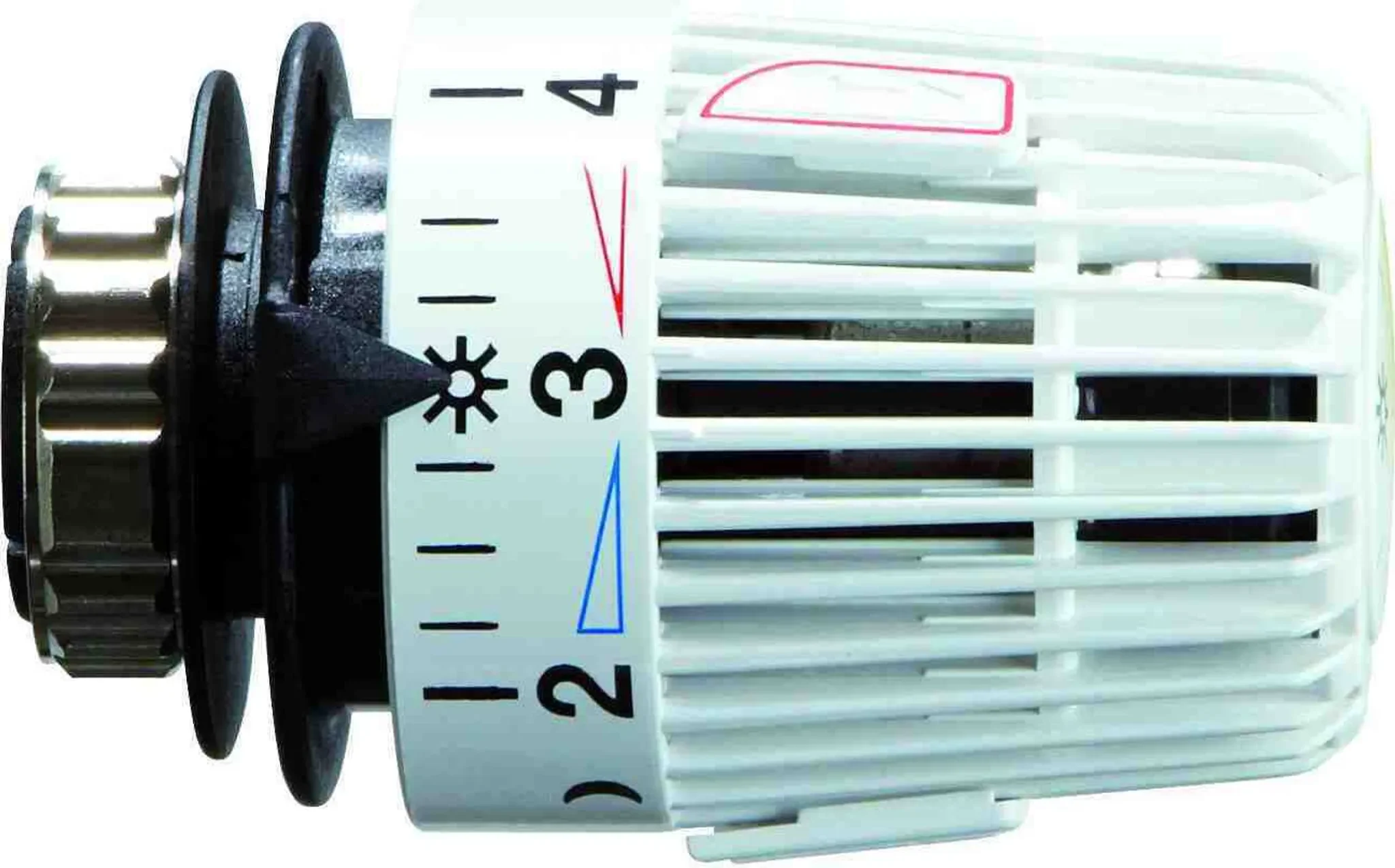 Der flüssigkeitsgefüllte Thermostat sorgt für hohe Stellkraft und hohe Regelgenauigkeit – selbst bei kleinen Auslegungsregeldifferenzen. Zwei Sparclips ermöglichen eine Begrenzung oder Blockierung eines gewünschten Temperaturbereichs. Die Skalenhaube in Weiß (RAL 9016), erfühlbare Markierungen und Symbole für Grundeinstellung sowie Nachtabsenkung erleichtern die Bedienung zusätzlich.