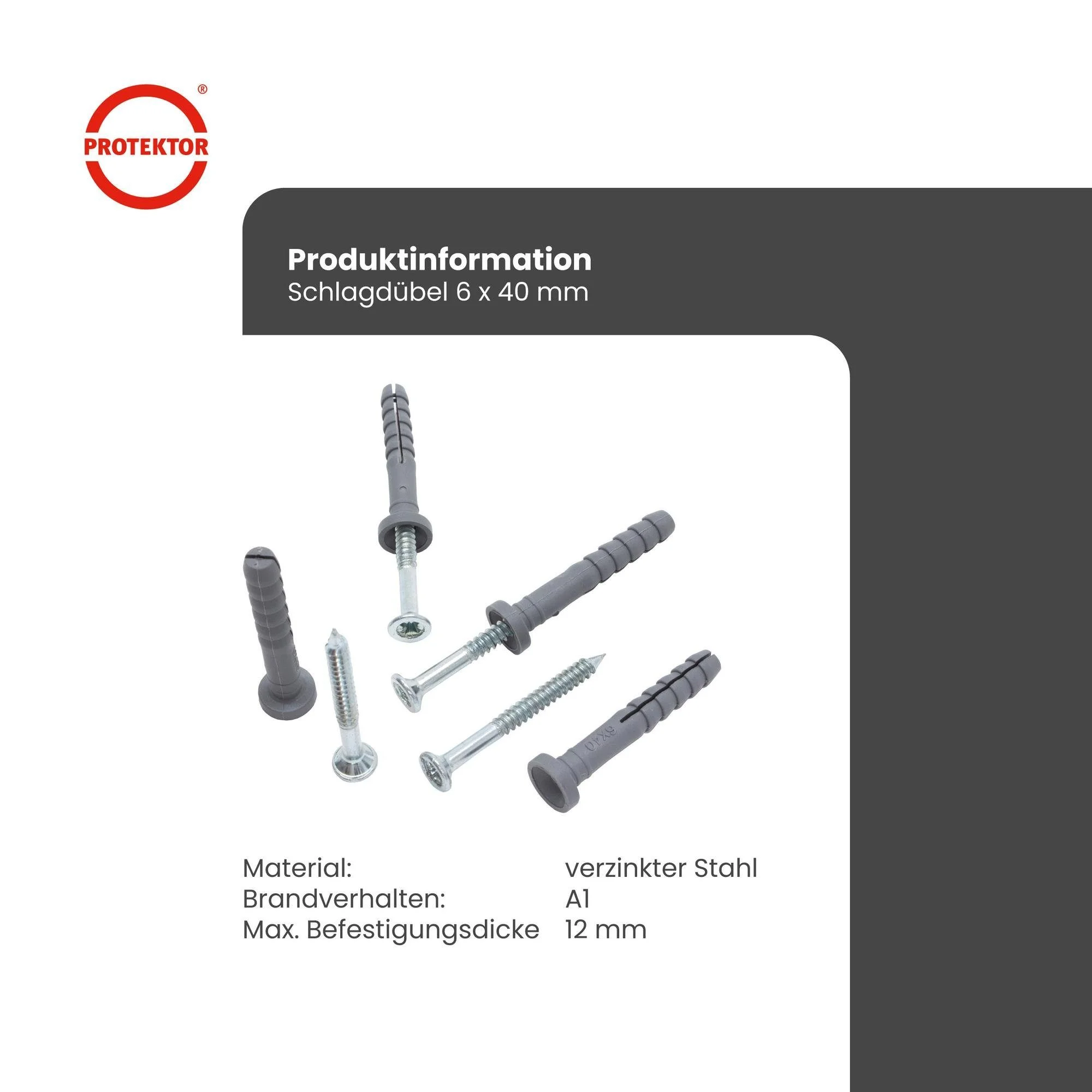 Die Befestigungsanker von PROTEKTOR wurden speziell für den Trockenbau entwickelt und ermöglichen die fachgerechte Montage von UW-Profilen. Dank eines Bohrdurchmessers von 6 mm und einer maximalen Befestigungsdicke von 12 mm lassen sich die Schlagdübel präzise und effizient verarbeiten.